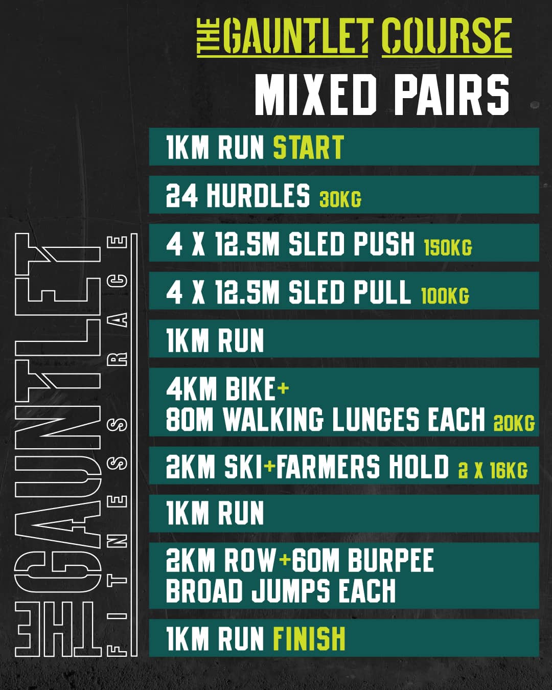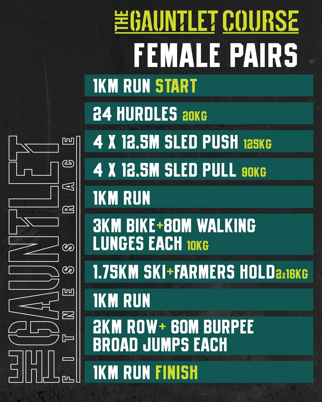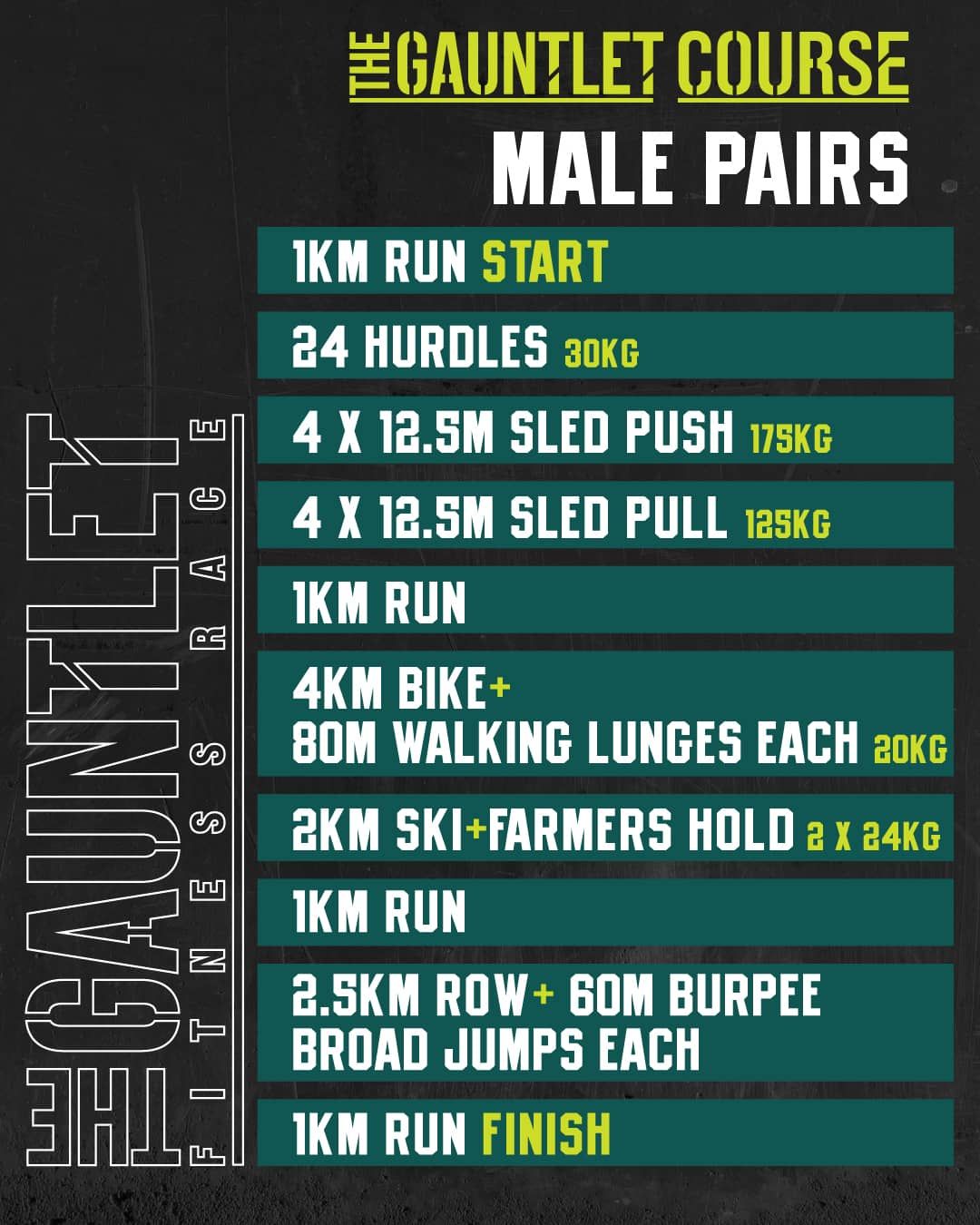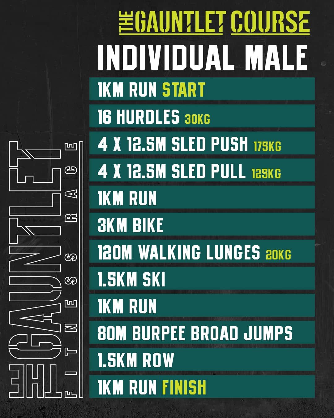 The Gauntlet has been designed as the ultimate test for the hybrid athlete. Born from a simple idea – that a fitness race should be about more than just running – it was built to give equal weight to the stations. No run, station, run, station formula here. The ergs, the sleds, the lunges – they matter just as much as the kilometres.
