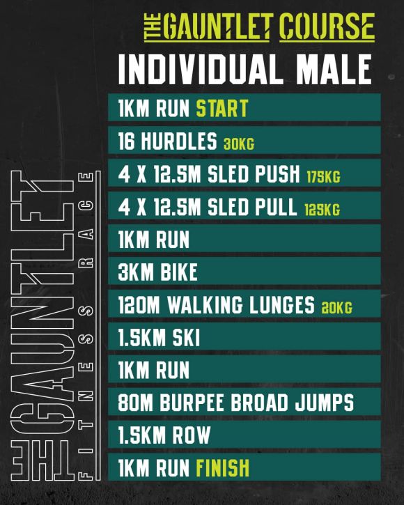 The Gauntlet alternates between runs and functional fitness stations, with the stations carrying equal importance to the running. Full details on the format and movement standards can be found on our Race Format page.